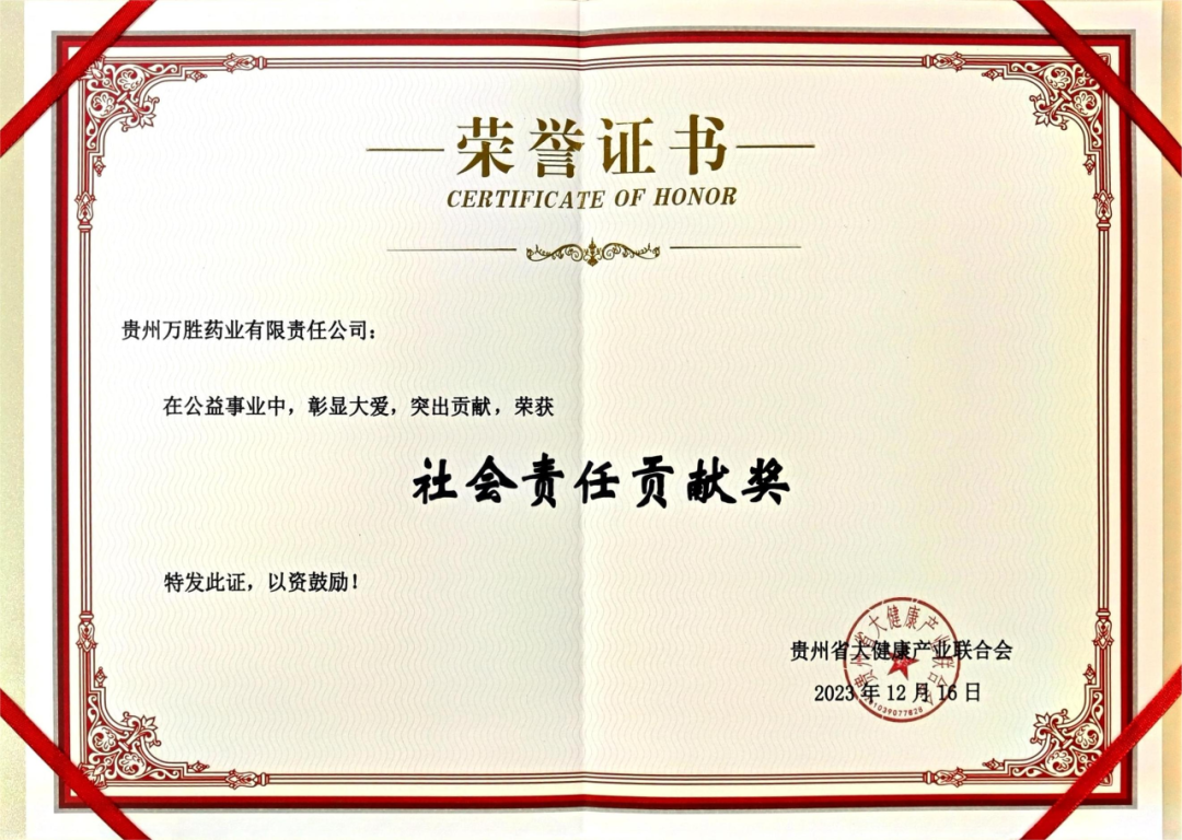 喜报! 贵州万胜药业自1995年成立以来,一直以实践企业社会责任为己任,持续推进公益项目,主动担当社会责任为实现企业与社会的协同发展贡献自己的力量。 近日,贵州万胜药业因在公益事业中,彰显大爱,突出贡献,被贵州省大健康产业联合会授予“社会责任贡献奖”荣誉称号。